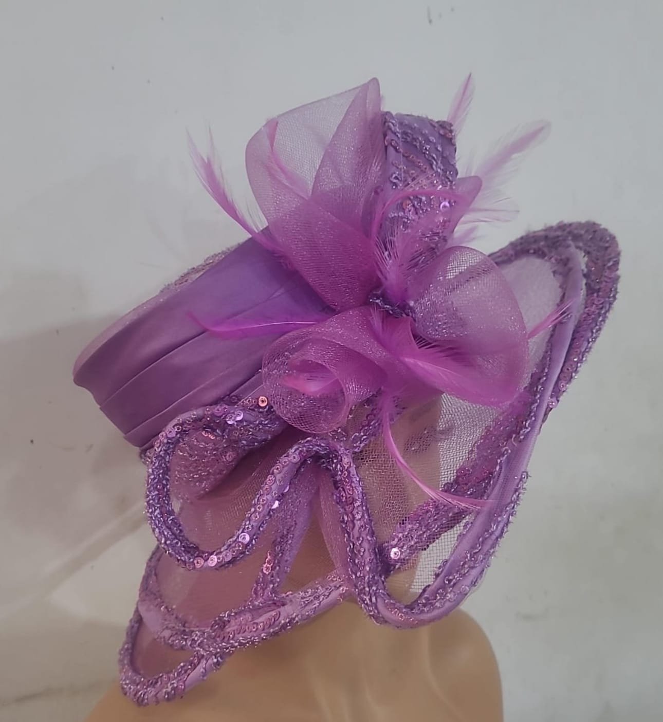The fascinator captivates with its sculptural arrangement of hand-shaped organza petals and loops, creating a mesmerizing three-dimensional effect. The artistic composition includes layered fabric manipulations and richly embroidered lace that catch and reflect light, adding movement and drama to your ensemble. The entire confection is uniquely designed to create an unforgettable visual impact.
